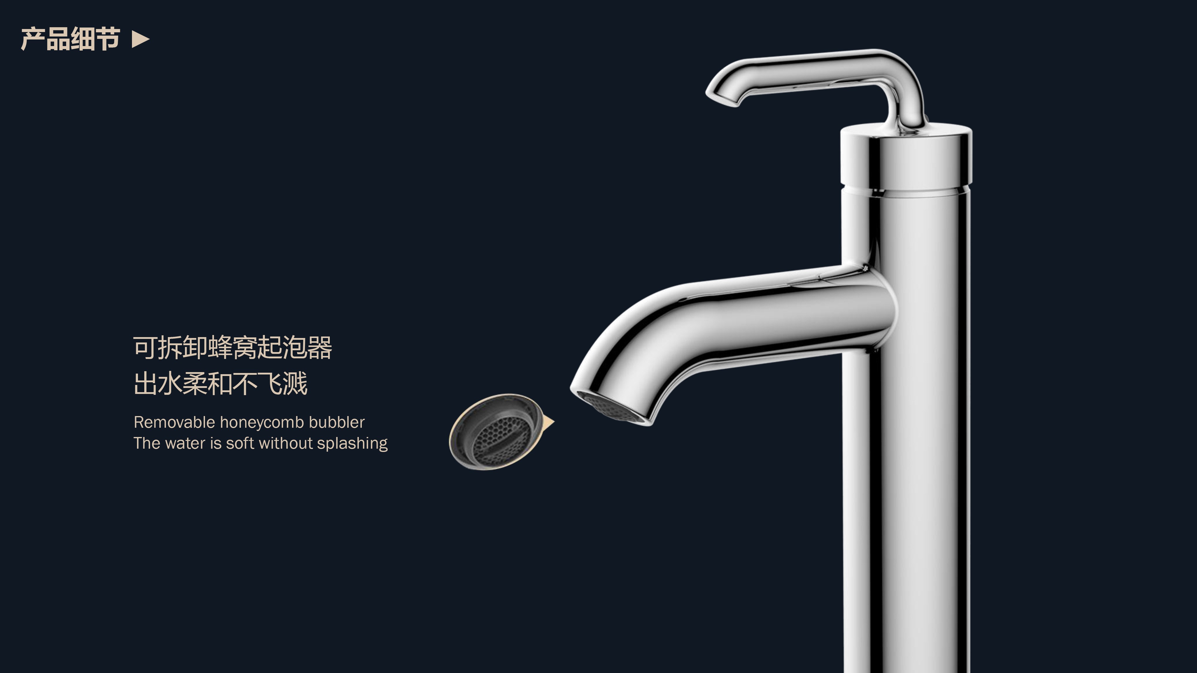 High posture, comfortable standing posture, not tiring waist with water; Detachable honeycomb bubbler, soft and non-splash water; Cold and hot dual control, smooth handle switch freely; Anti-leakage ceramic valve core, smooth and durable opening and closing; Without tools, push and screw, and install quickly in 10 seconds