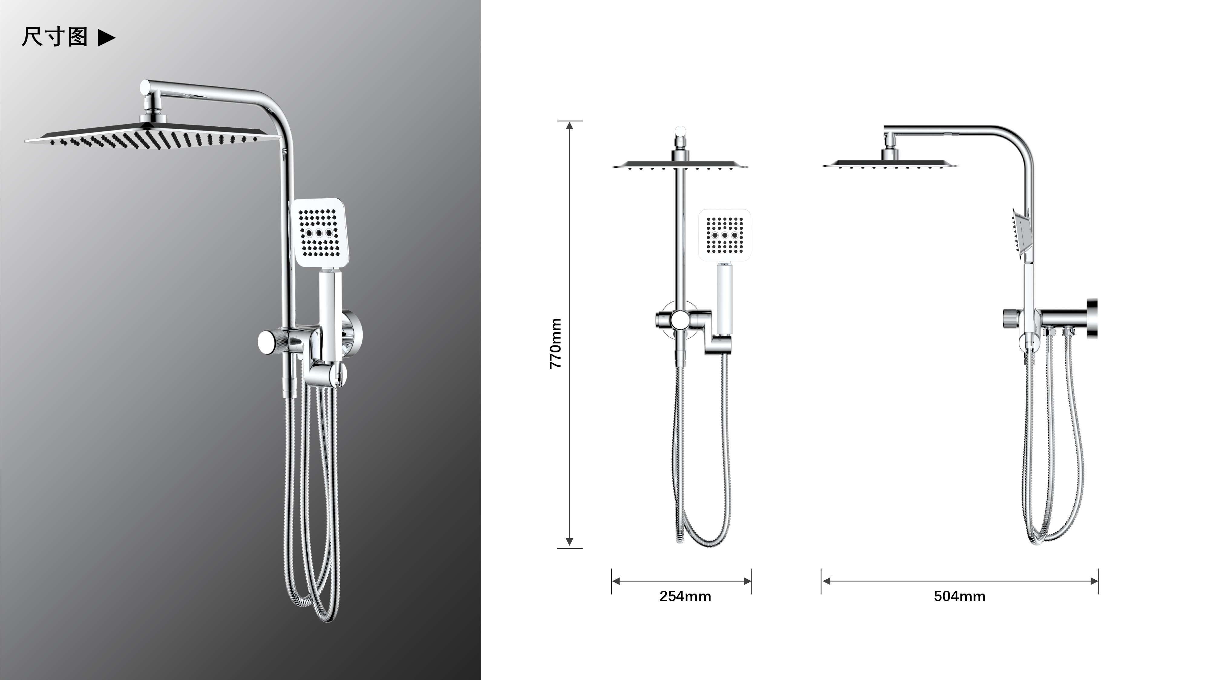 方形寬大頂噴;Z字形三通;按壓切換頂噴/花灑出水